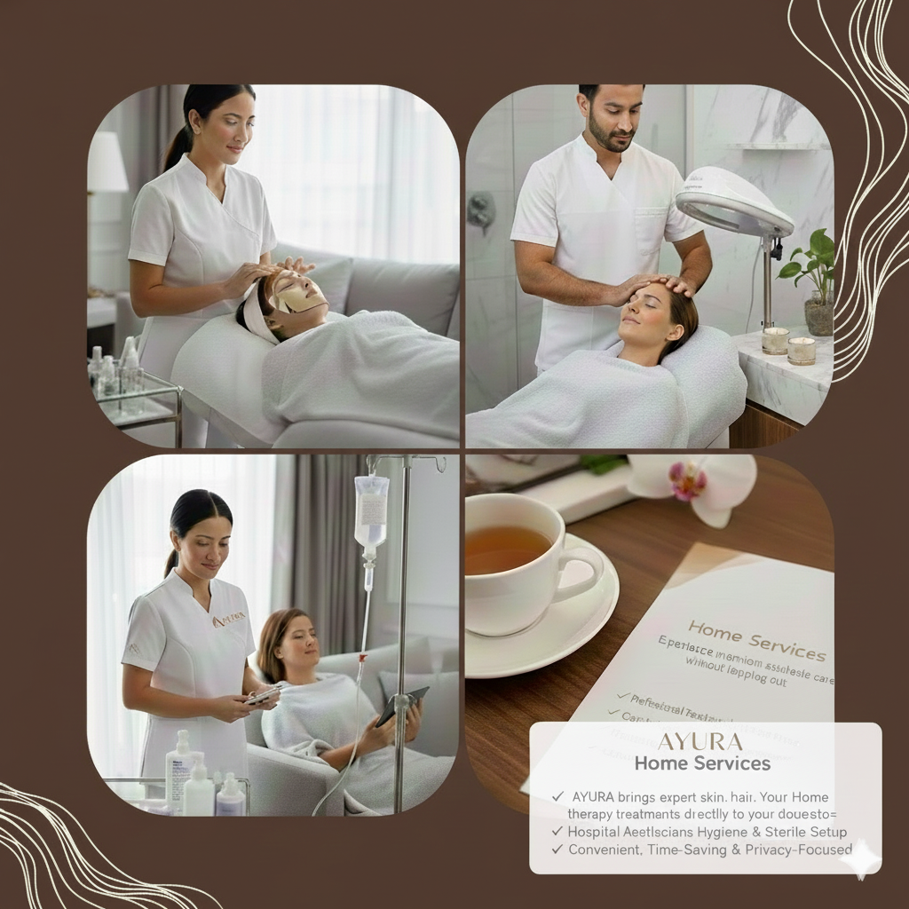 Experience premium aesthetic care without stepping out. AYURA brings expert skin, hair, and IV therapy treatments directly to your doorstep—with the same safety, precision, and luxury as our clinic.